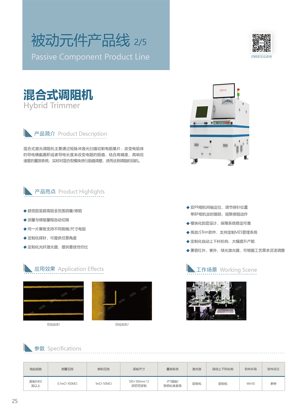 混合式激光調阻機主要通過短脈沖激光掃描切割電阻基片,改變電阻體的導電橫截面積或者導電長度來改變電阻的阻值,