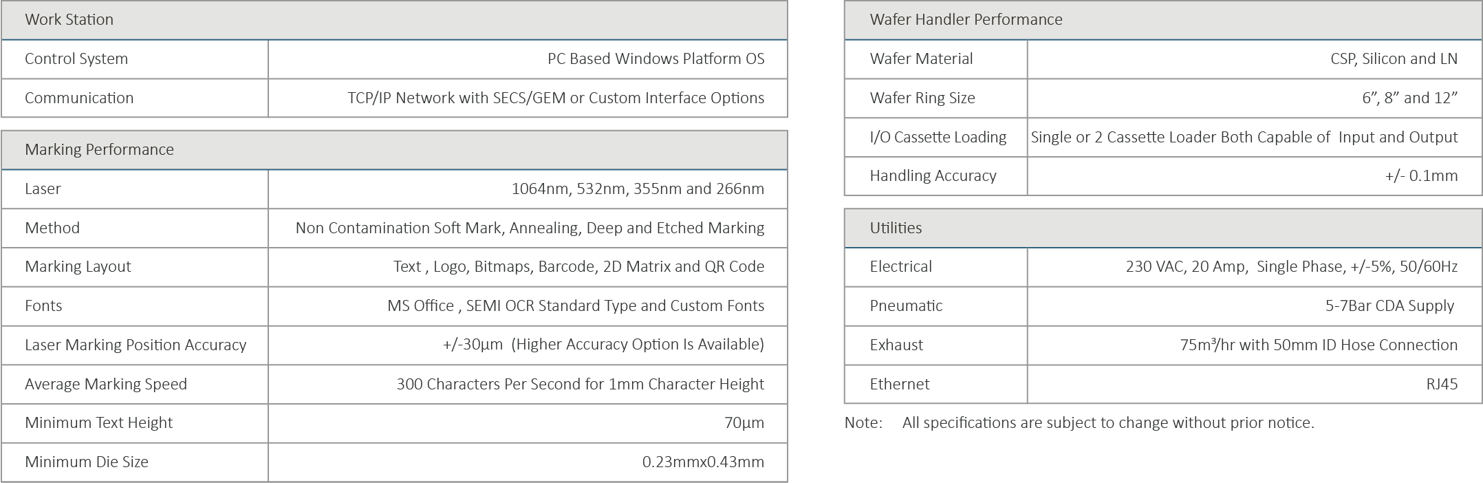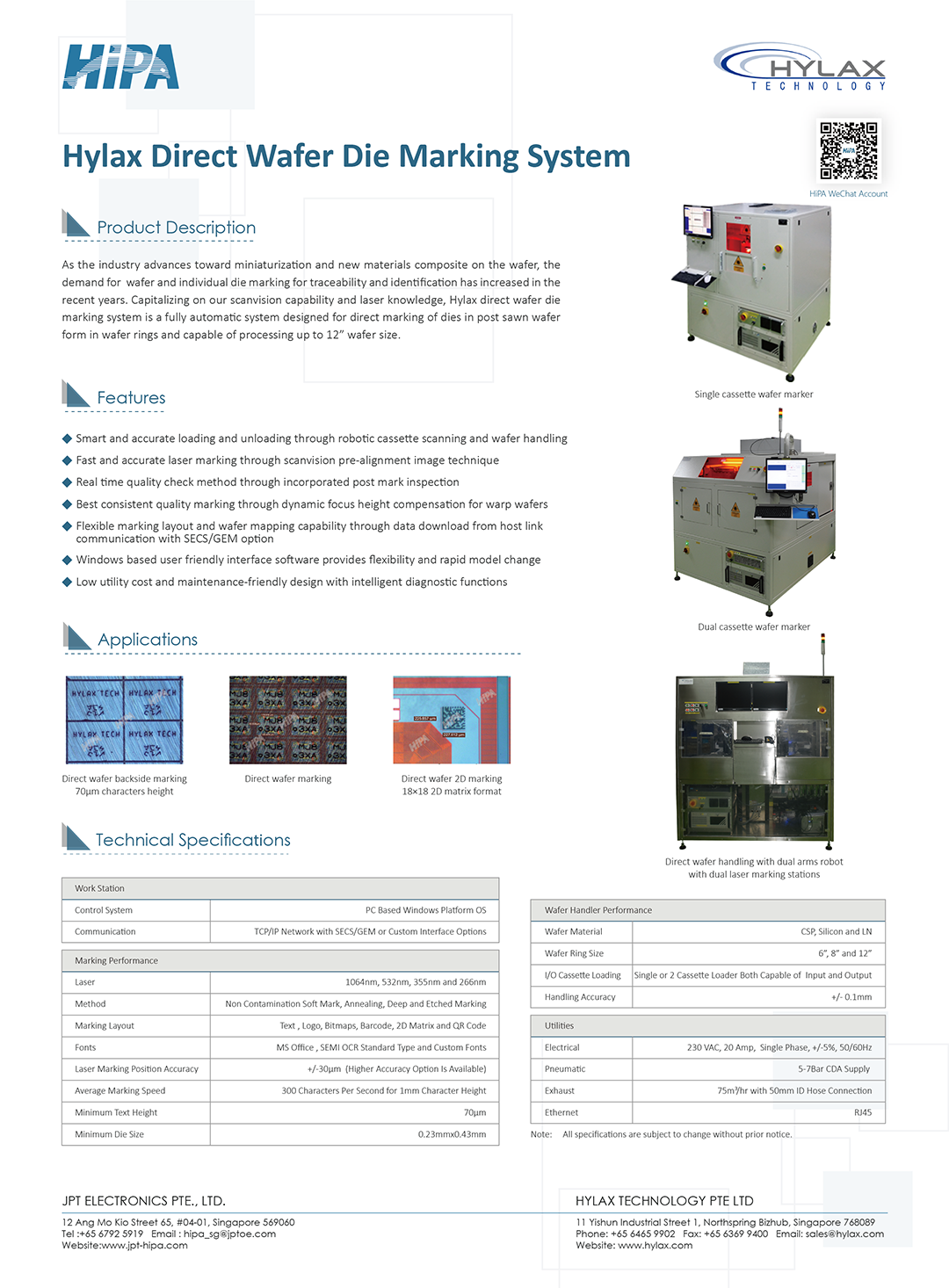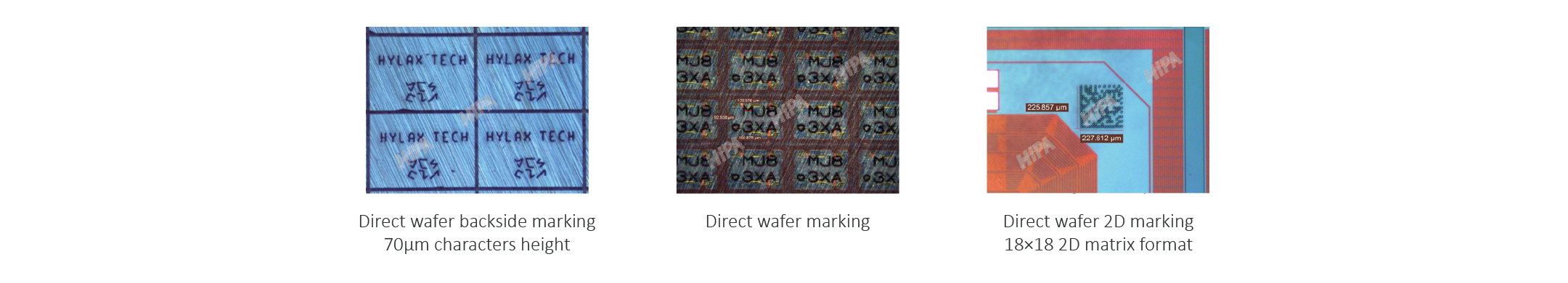 As the industry advances toward miniaturization and new materials composite on the wafer, the demand for wafer and individual die marking for traceability and identification has increased in the recent years. Capitalizing on our scanvision capability and laser knowledge, Hylax direct wafer die marking system is a fully automatic system designed for direct marking of dies in post sawn wafer form in wafer rings and capable of processing up to 4” -8” wafer size.