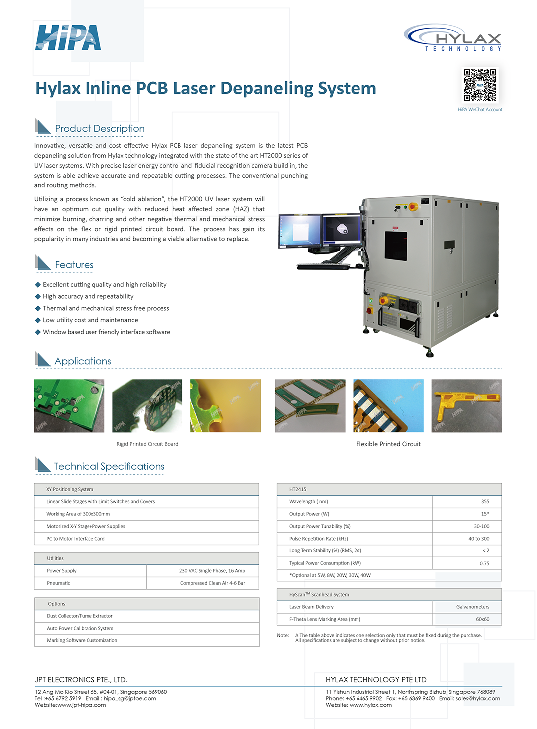 Innovative, versatile and cost effective Hylax PCB laser depaneling system is the latest PCB depaneling solution from Hylax technology integrated with the state of the art HT2000 series of UV laser systems. With precise laser energy control and fiducial recognition camera build in, the system is able achieve accurate and repeatable cutting processes. The conventional punching and routing methods.