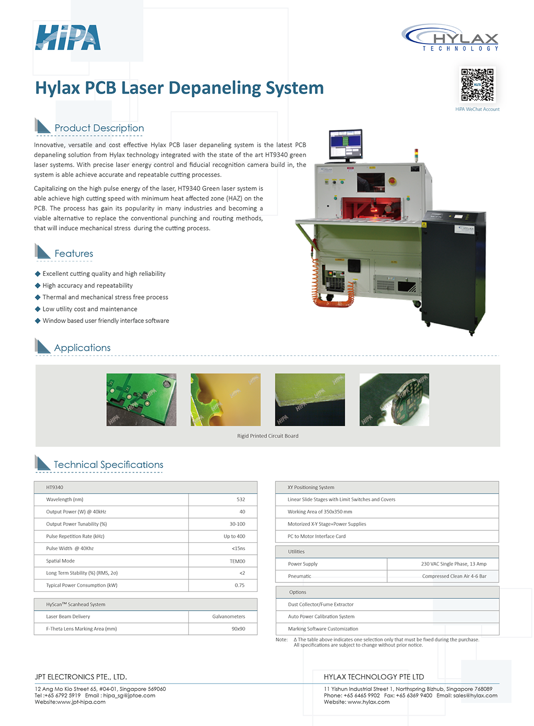 Innovative, versatile and cost effective Hylax PCB laser depaneling system is the latest PCB depaneling solution from Hylax technology integrated with the state of the art HT9340 green laser systems. With precise laser energy control and fiducial recognition camera build in, the system is able achieve accurate and repeatable cutting processes.