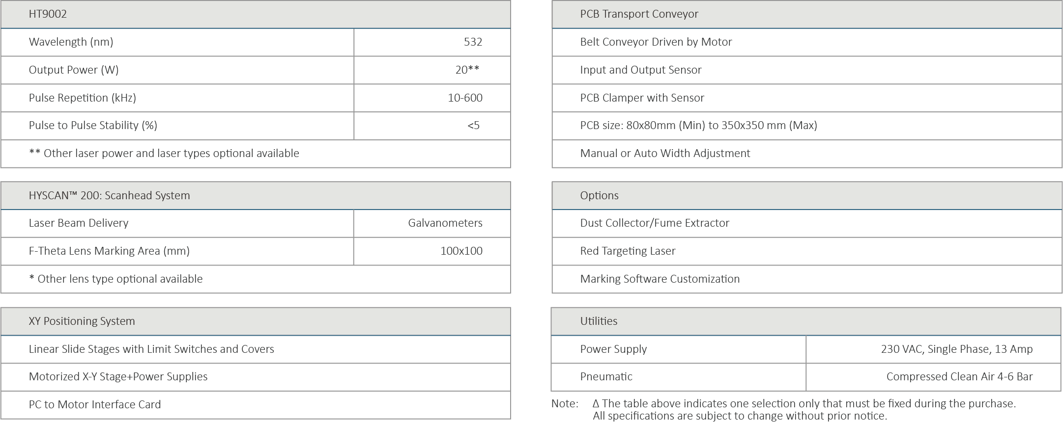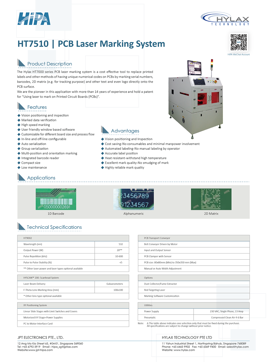 The Hylax HT7000 series PCB laser marking system is a cost effective tool to replace printed labels and other methods of having unique numerical codes on PCBs by marking serial numbers, barcodes, 2D matrix (e.g. for tracking purpose) and other text and even logo directly onto the PCB surface.