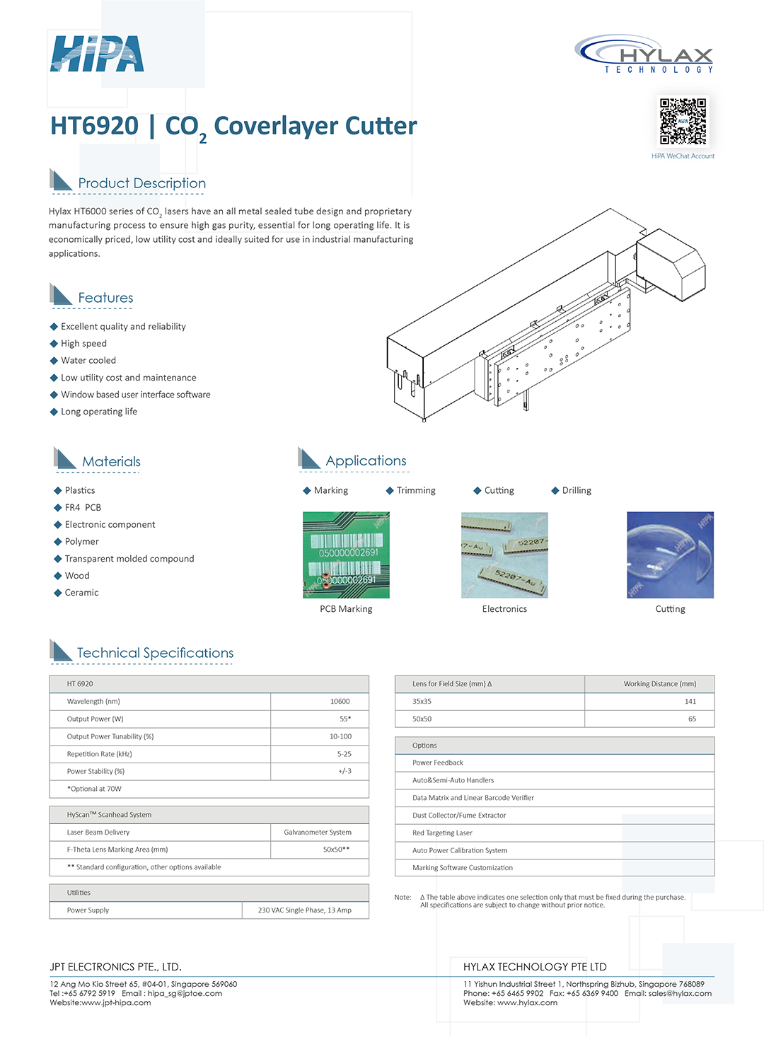 Hylax HT6000 series of CO2 lasers have an all metal sealed tube design and proprietary manufacturing process to ensure high gas purity, essential for long operating life. It is economically priced, low utility cost and ideally suited for use in industrial manufacturing applications.