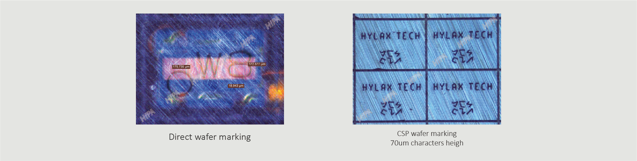 Hylax HT2660 DUV laser are very effective in the micro range clean marking applications for semicon wafers. With the low heat generation and small beam diameter, HT2660 UV lasers are able to achieve high contrast and micron level permanent marking on sensitive products and materials.