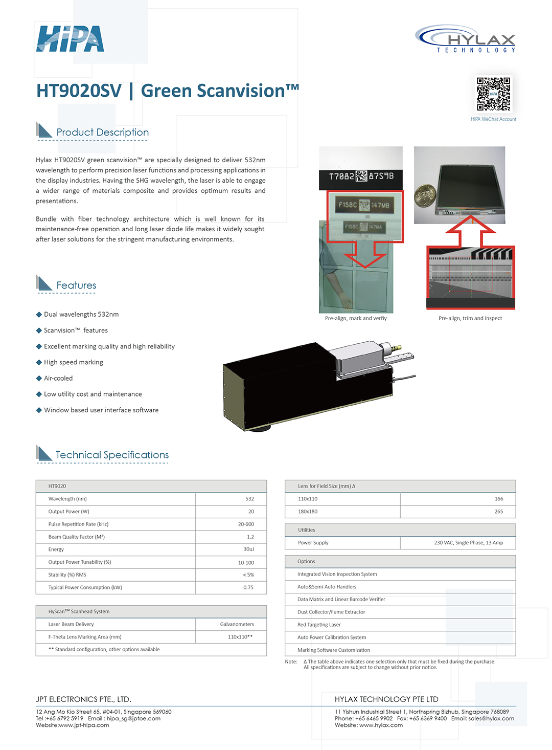 Hylax HT9020SV green scanvision? are specially designed to deliver 532nm wavelength to perform precision laser functions and processing applications in the display industries. Having the SHG wavelength, the laser is able to engage a wider range of materials composite and provides optimum results and presentations.